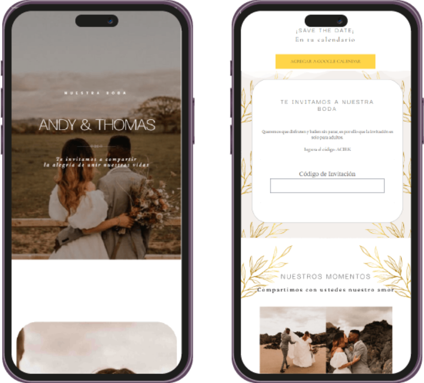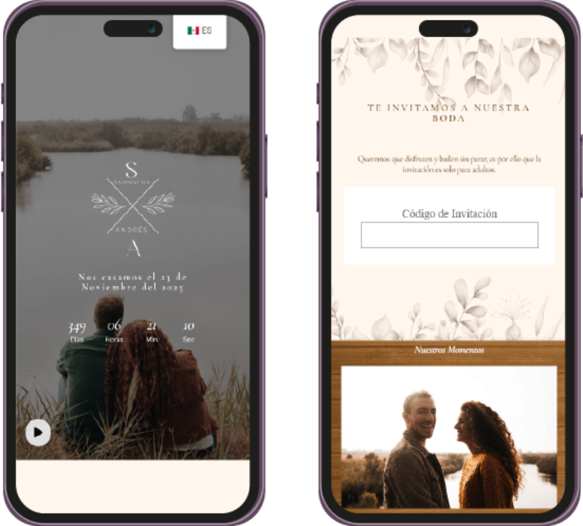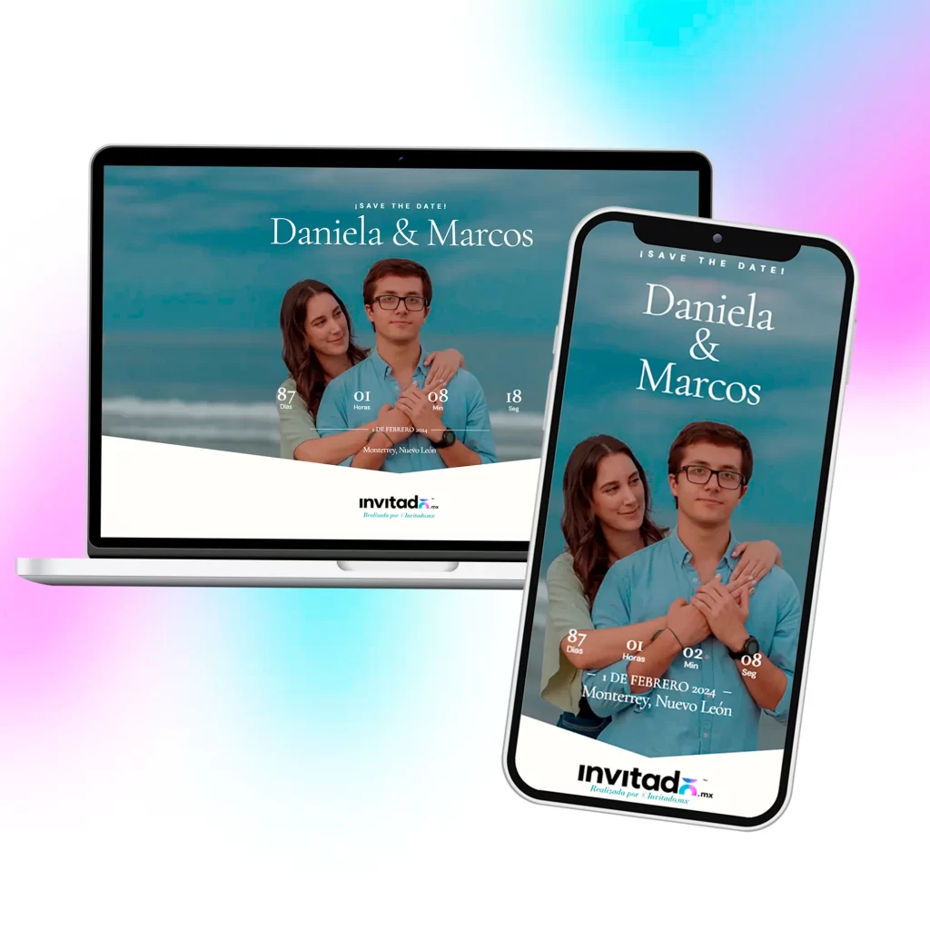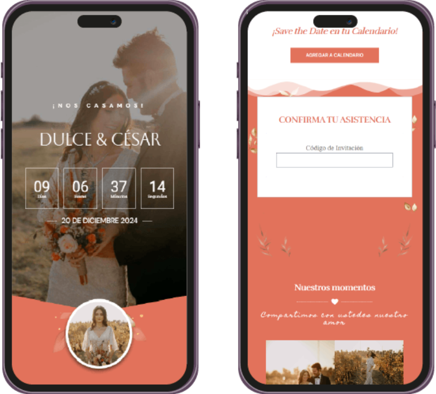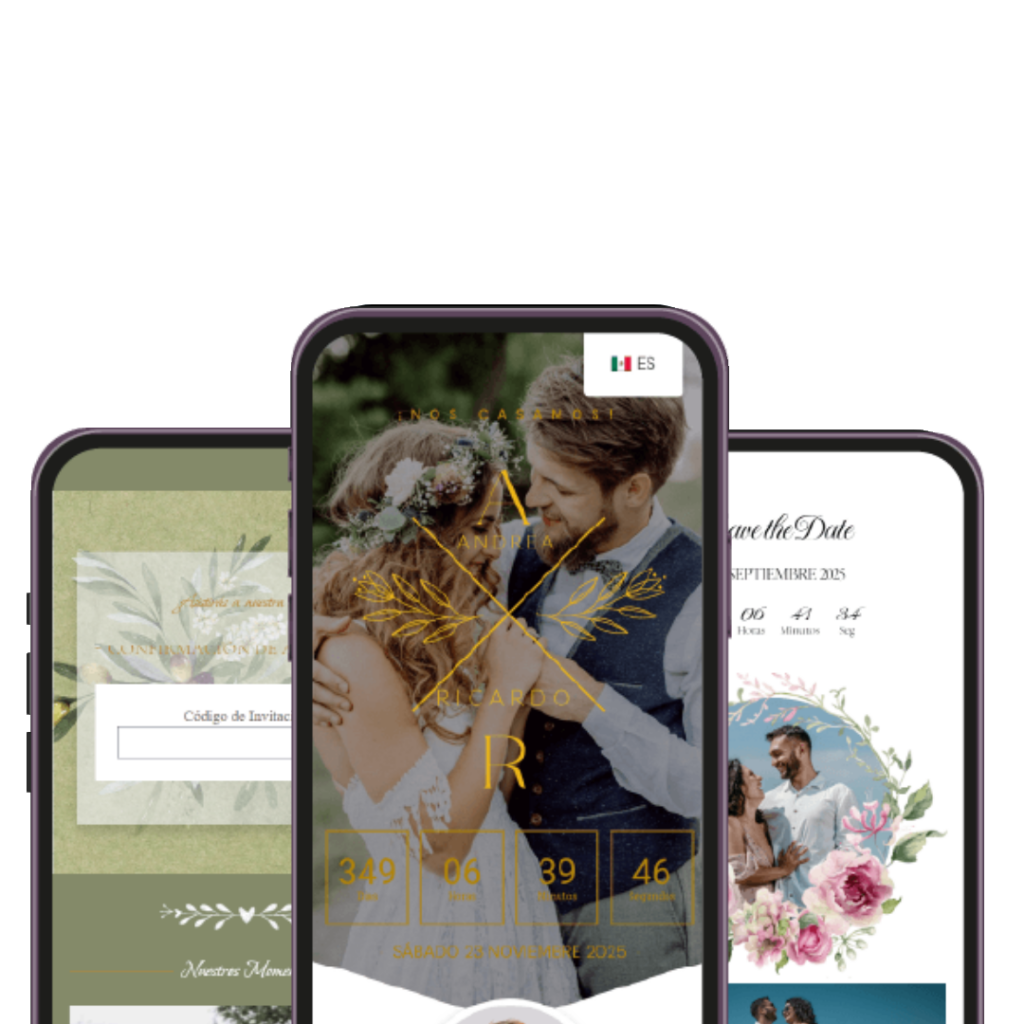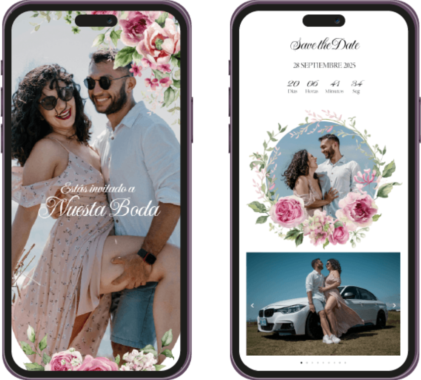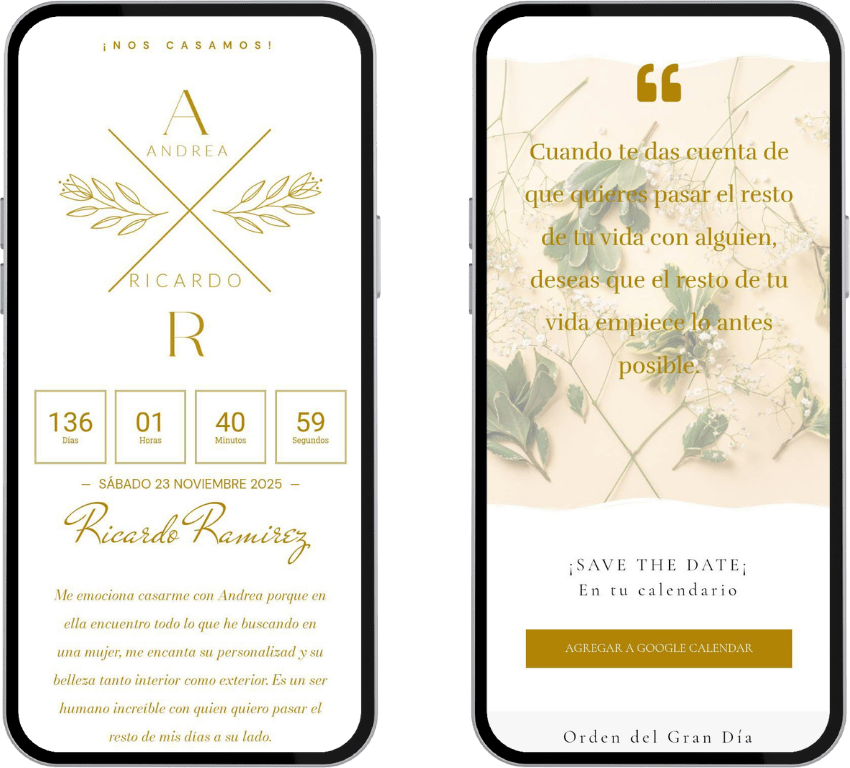 Un recordatorio visual único, perfecto para enviar por WhatsApp o redes sociales, para que tus invitados marquen la fecha en sus calendarios. Ya sea en imagen o web, hazles saber a tus invitados que tu evento se acerca.