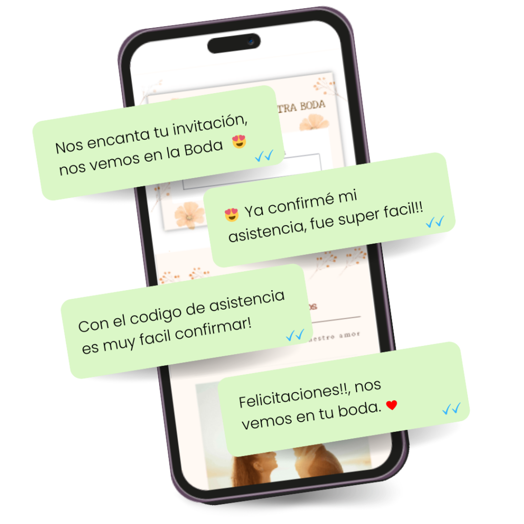 Tus invitados podrán acceder a la invitación desde cualquier lugar y en cualquier dispositivo, sin preocuparse por perderla, tambien podrás llevar un registro digital de quiénes confirmaron su asistencia y recibir respuestas rápidamente por medio de nuestra app